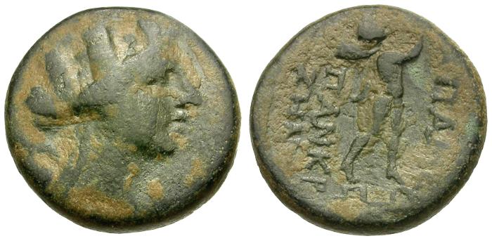 Obverse: Turreted bust of Artemis-Tyche right, with bow and quiver over shoulder