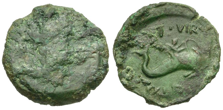 | Spain. Iberia. Carteia Æ Quadrans / Cupid Riding Dolphin |