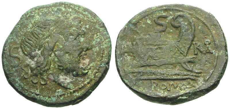 Reverse: Prow right, S above, ROMA in monogram before, ROMA in exergue