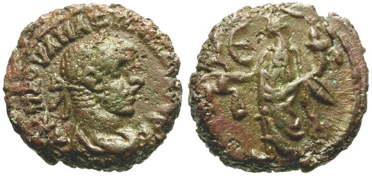 Obverse: A K M A OVA MAΞIMIANOC CЄB, laureate, draped bust right