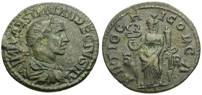 Reverse: ANTIOCH-I COL CA, Fortuna standing facing, holding caduceus and cornucopia, S-R across fields