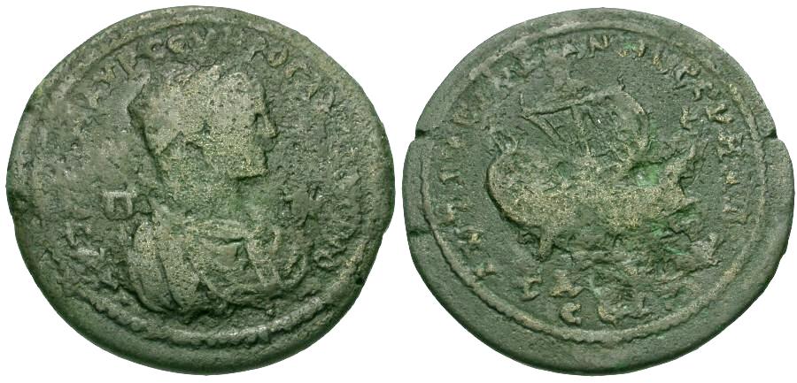 | Caracalla (AD 198-217). Cilicia. Tarsus Æ35 / Galley |