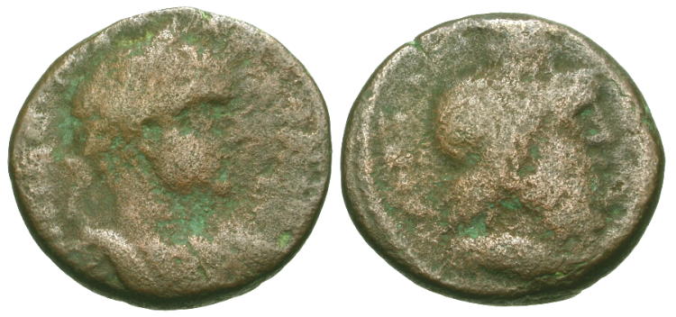 |  Elagabalus (AD 218-222). Samaria. Caesarea Maritima Æ22 / Bust of Serapis |