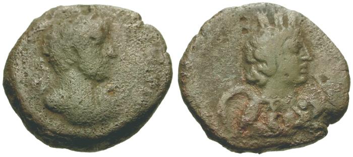 |  Hadrian (AD 117-138). Arabia. Bostra Æ19 / Bust of Arabia |