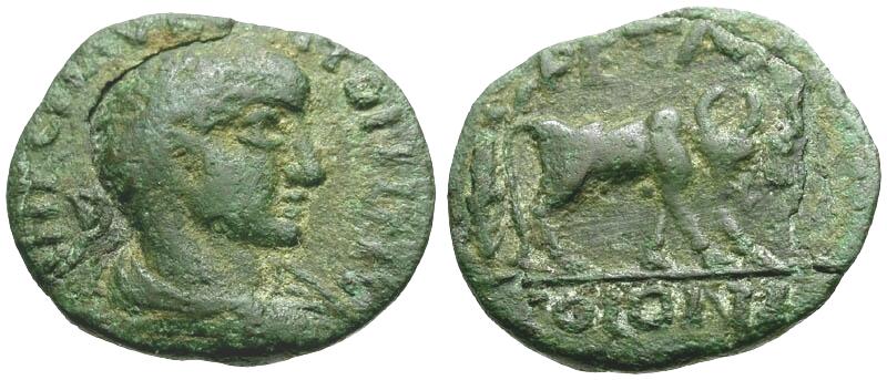 |  Elagabalus (AD 218-222). Arabia. Petra Æ20 / Colonist Ploughing |