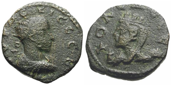 Obverse: AVΓ ΔЄKIO CЄB, radiate, draped and cuirassed bust right