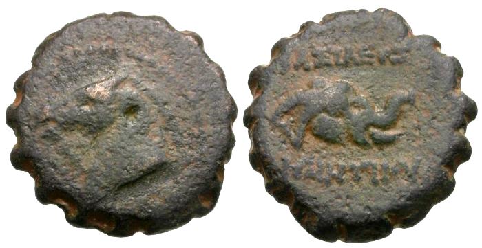 » Lot Info: Seleukid Kings. Demetrios I Soter (162-150 BC) Æ17 Serrate / Elephant