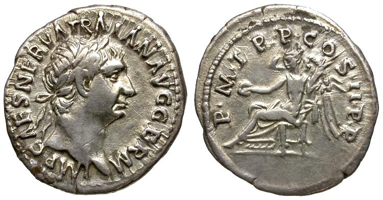 Obverse: IMP CAES NERVA TRAIAN AVG GERM, laureate head right