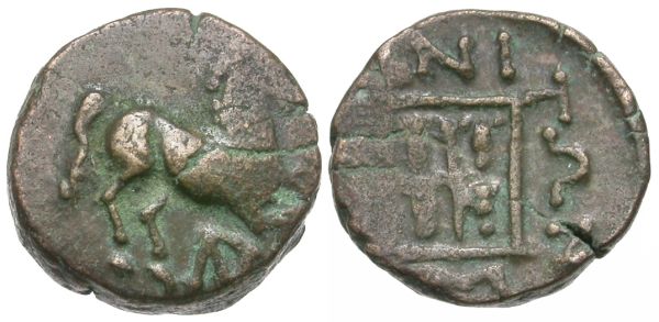 Reverse: ΜΑΡ-ΩΝΙ-ΤΩΝ, branch with four vine leaves within square border