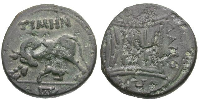 Obverse: TIMHN, cow standing left, looking back at suckling calf; ΓKPA monogram below