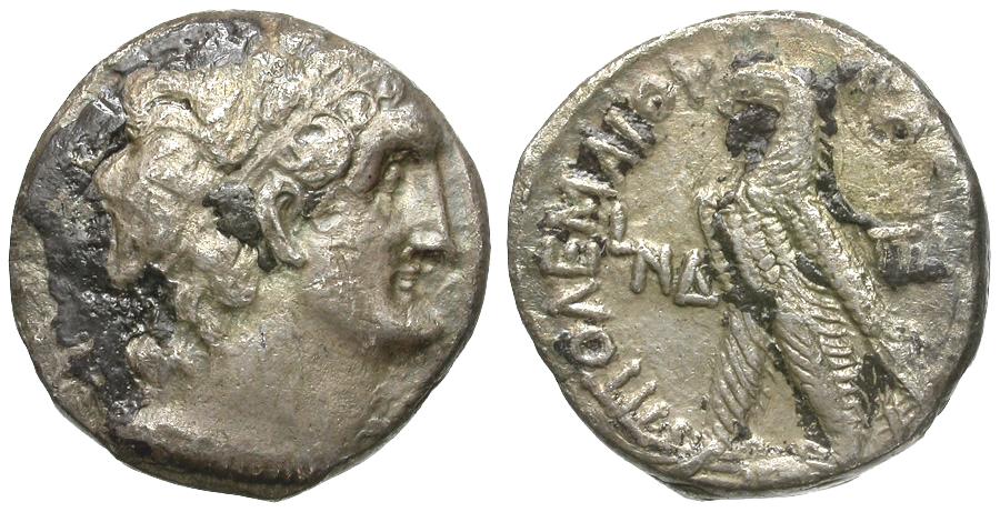 Reverse: BAΣIΛEΩΣ ΠTOΛEMAIOY, eagle standing left on thunderbolt, wings closed; LNΔ (date) in left field, ΠA in right field
