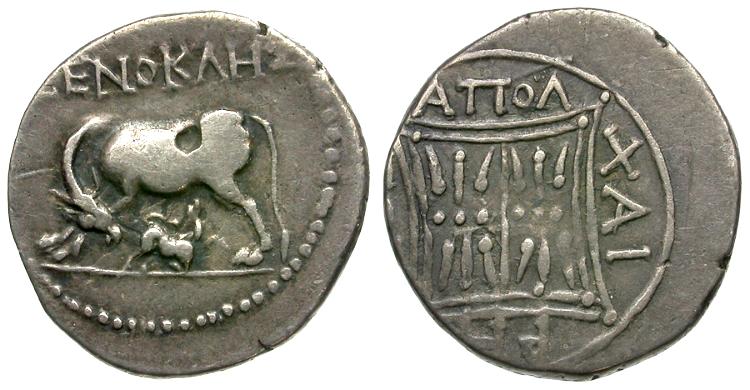 Obverse: ΞENOKΛHΣ, cow standing left, suckling calf