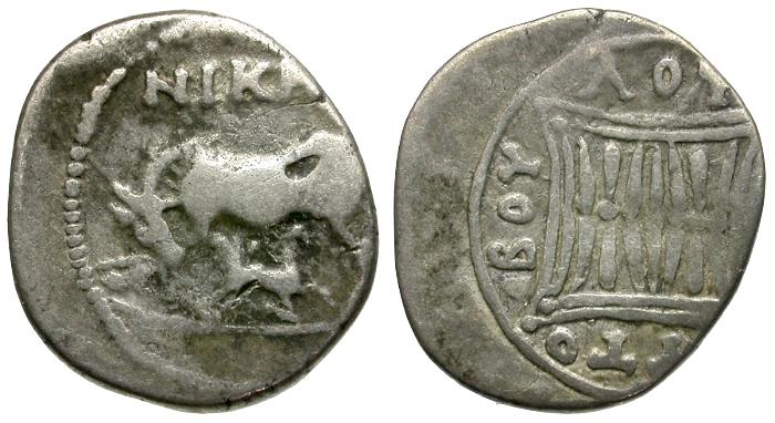 Obverse: NIKHN, cow standing left, head revereted, suckling calf