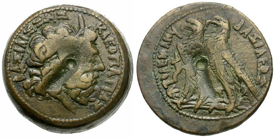 | Ptolemaic Kings of Egypt. Ptolemy VI Philometor (AD 180-145 BC). In the names of Queen Cleopatra I and Ptolemy the King Æ29 / Two Eagles |