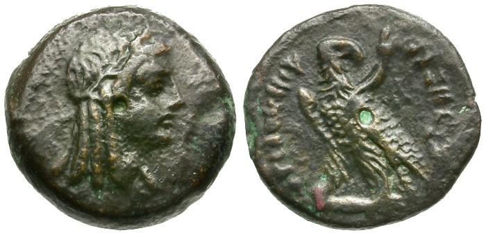 Reverse: ΒΑΣΙΛΕΩΣ ΠΤΟΛΕΜΑΙΟΥ, eagle standing left on thunderbolt, wings closed, head reverted, cornucopia on wing
