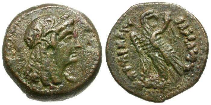 Reverse: ΒΑΣΙΛΕΩΣ ΠΤΟΛΕΜΑΙΟΥ, eagle standing left on thunderbolt, wings closed, head reverted, cornucopia on wing