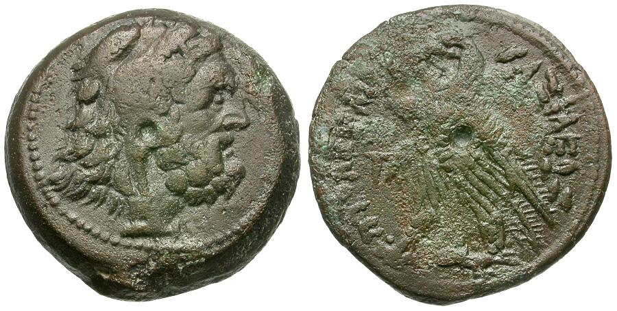 Reverse: BAΣIΛEΩΣ ΠTOΛEMAIOY, eagle standing left on thunderbolt, wings closed; ΠA monogram in left field