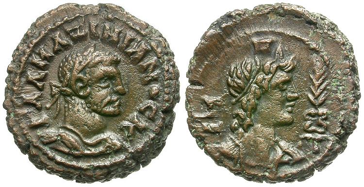 Obverse: ΓΑΛ ΜΑΞΙΜΙΑΝΟϹ Κ, laureate, draped and cuirassed bust right, seen from the front