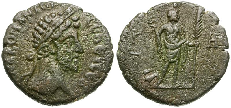 Obverse: Μ Α ΚΟΜ ΑΝΤⲰ ϹЄΒ ЄVϹЄΒ, laureate head right