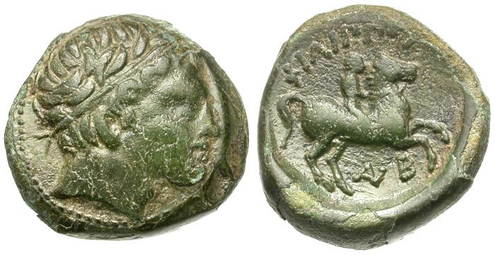 Reverse: ΦIΛIΠΠOY, youth on horseback right; AI monogram - B below