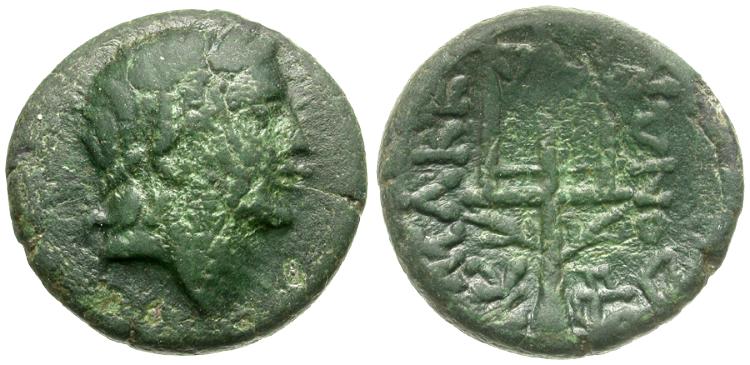 Attribution: SNG Copenhagen 1298 Date: 221-168 BC Obverse: Head of Apollo right Reverse: Trident Size: 20.84mm Weight: 7.30 grams Rarity: 5 Description: VF