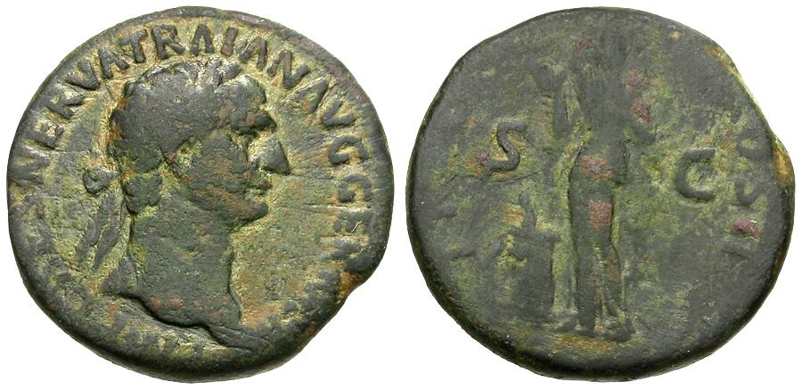 | Trajan (AD 98-117) Æ As / Pietas |
