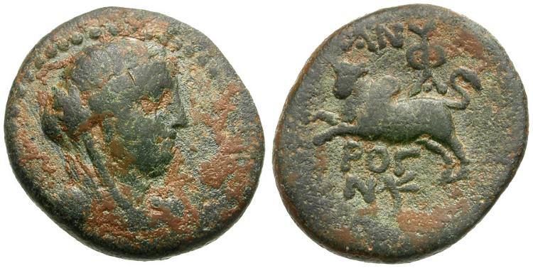 Reverse: Humped bull leaping left, AN (monogram) above; POΓ (date) / N𐤀