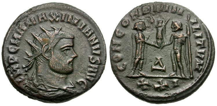 Obverse: IMP C M A MAXIMIANVS AVG, laureate, draped and cuirassed bust right