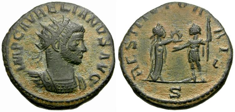 Obverse: IMP C AVRELIANVS AVG, radiate and cuirassed bust right