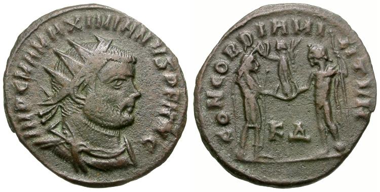 Obverse: IMP C MA MAXIMIANVS P F AVG, radiate, draped and cuirassed bust right