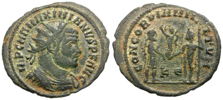 Obverse: IMP C M A MAXIMIANVS P F AVG, radiate and cuirassed bust right