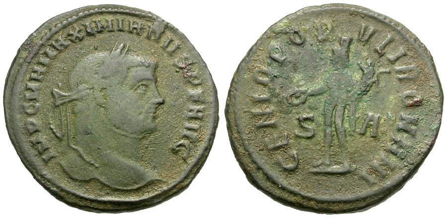Obverse: IMP C M A MAXIMIANVS P F AVG, laureate head right
