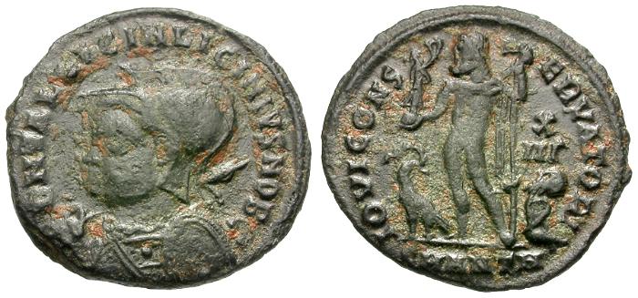 Obverse: D N VAL LICIN LICINIVS NOB C, helmeted and cuirassed bust left, spear over right shoulder and shield on left arm