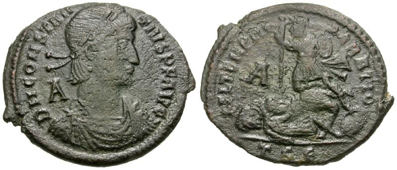 Obverse: DN CONSTAN-TIVS PF AVG, pearl-diademed and cuirassed bust right; A behind