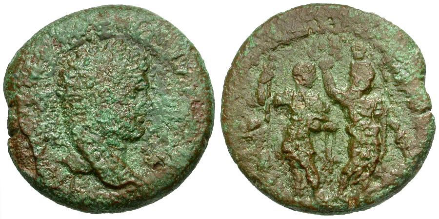 Reverse: Caracalla standing facing, head right, holding spear and globe, crowned by Serapis standing left; [LKA] (date) in left field