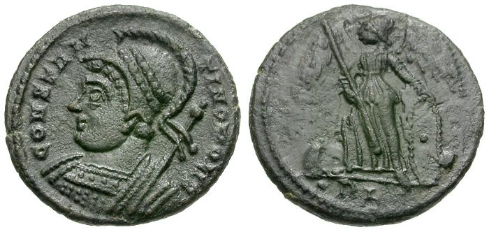 Obverse: CONSTAN-TINOPOLIS, laureate, helmeted and cuirassed bust of Constantinopolis left, with scepter over shoulder