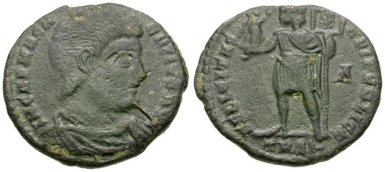 Reverse: FELICITAS REIPVBLICE, emperor standing facing, head left, holding Victory and labarum inscribed with Chi-Rho, A in right field, TRP∪ in exergue