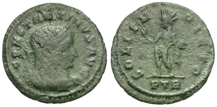 Reverse: SOLI IN-VICTO, Sol standing left, holding globe, hand raised; PTR in exergue