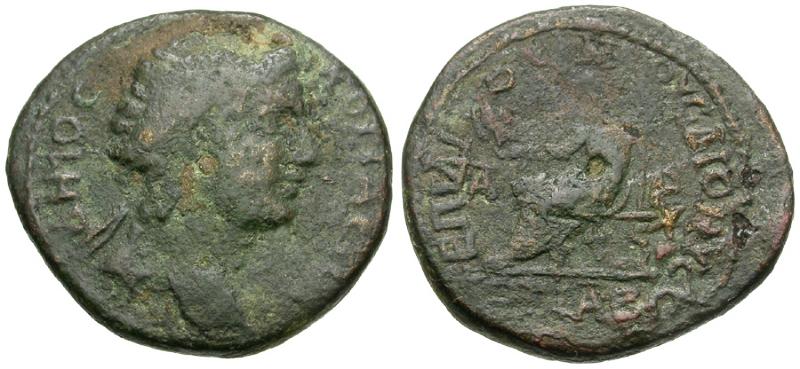 Attribution: SNG von Aulock 3776 Date: AD 253-268 Obverse: Laureate head right Reverse: Zeus seated left, holding eagle and scepter Size: 23.89mm Weight: 7.36 grams Rarity: 5 Description: good Fine