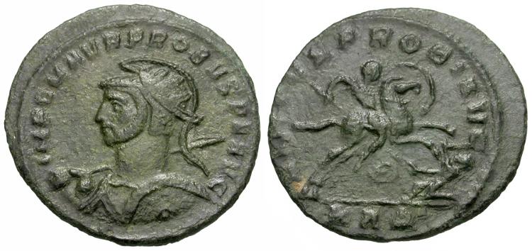 Obverse: IMP C M AVR PROBVS P F AVG, radiate, helmeted and cuirassed bust left, spear over right shoulder, shield at left shoulder