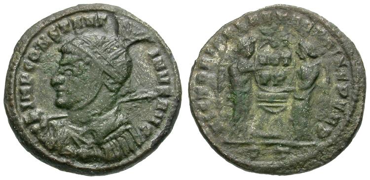 Obverse: IMP CONSTANT-INVS AVG, helmeted and cuirassed bust left, holding spear over shoulder