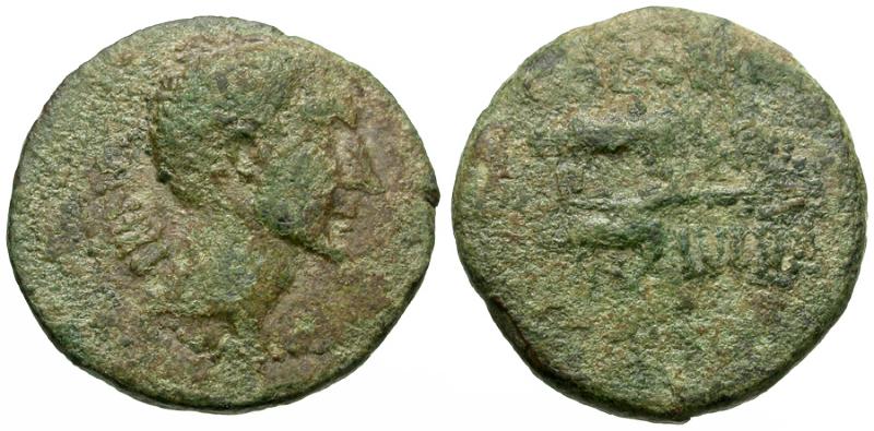 Attribution: RPC I 4083 Date: 27 BC- AD 14 Obverse: Bare head right Reverse: Team of zebus (humped bulls) left, yoked to plough Size: 22.14mm Weight: 6.18 grams Rarity: 5 Description: good Fine