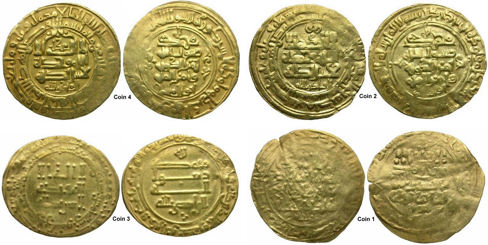 Here are the results: Coin 1: weight 2.14 grams, .8647 gold or 1.85 grams of gold and .0917 silver or .196 gram of silver; Coin 2: weight 3.66 grams, .7099 gold or 2.598 grams of gold and .2752 silver or 1.00 gram of silver; Coin 3: weight 4.42 grams, .7260 gold or 3.209 grams of gold and .2740 silver or 1.211 grams of silver; Coin 4: weight 4.28 grams, .7230 gold or 3.094 grams of gold and .2550 silver or .963 grams of silver. The total for the lot of four coins is: 10.751 grams of gold.