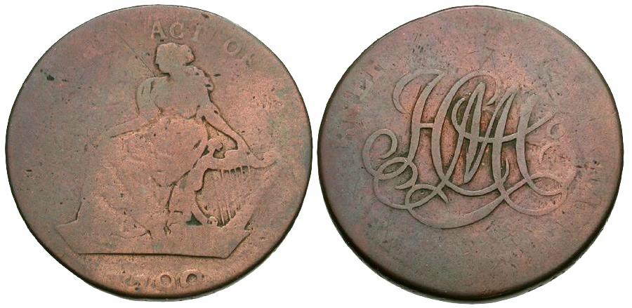 Obverse: [INCORPORATED BY] ACT OF [PARLIAMENT] / 1792, Hibernia seated left, hand resting on harp