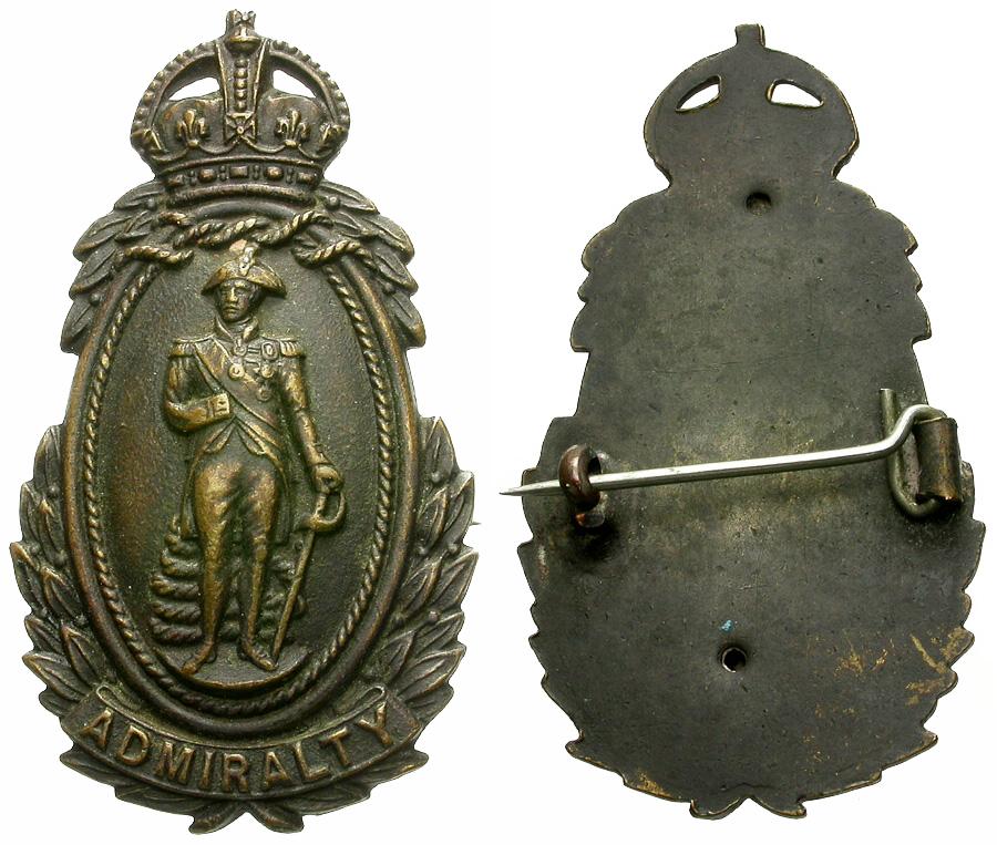 Obverse: Badge depicting Nelson standing facing within crowned oval frame entwined with rope and set on oak wreath and ribbon inscribed ADMIRALTY