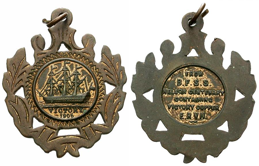 Reverse: FROM / B.F.S.S. / NELSON CENTENARY / CONTAINING / VICTORY COPPER / E.R.VII.