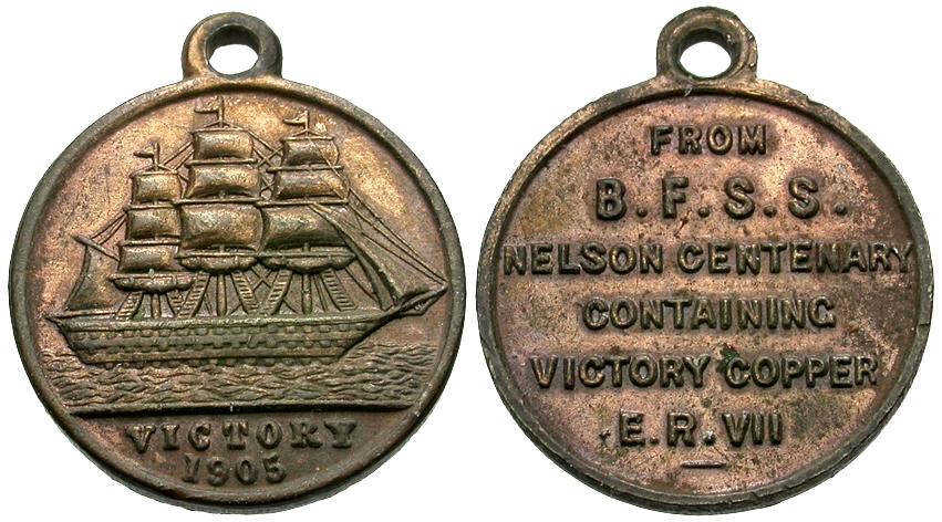 Reverse: FROM / B.F.S.S. / NELSON CENTENARY / CONTAINING / VICTORY COPPER / E.R.VII