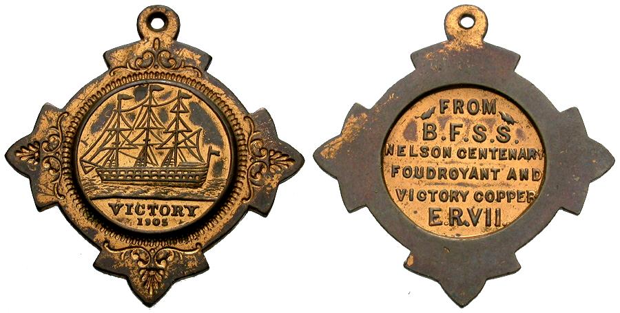 Reverse: FROM / B.F.S.S. / NELSON CENTENARY / CONTAINING / VICTORY COPPER / E.R.VII.
