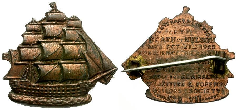 Reverse: CENTENARY MEMENTO / OF THE / DEATH OF NELSON / 1805 OCT 21ST 1905 / CONTAINING COPPER FROM THE / H.M.S. VICTORY / THE GIFT OF THE / LORDS OF THE ADMIRALTY / TO BRITISH * FOREIGN / SAILOR’S SOCIETY / E R VII.