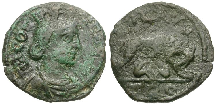 Reverse: COL AVG / TRO, she-wolf standing right, suckling Romulus and Remus
